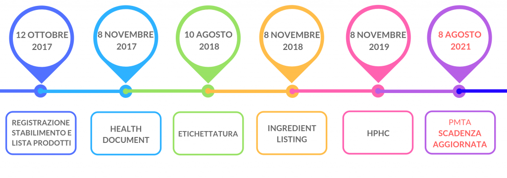 Le scadenze indicate in questa timeline si riferiscono a prodotti già sul mercato alla data dell’8 Agosto 2016 commercializzati da produttori/importatori di piccola scala (fino a 150 impiegati a tempo pieno o equivalenti e fino a $5.000.000 di ricavi annui).